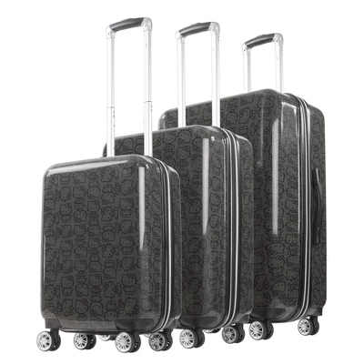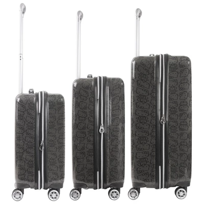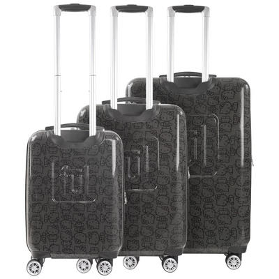 Can’t get enough of Hello Kitty? Jet set around the world with this 3-piece set with a 21″ carry-on and 25″ & 29″ check bags, all-over print hard-sided black spinner suitcases rolling luggage. Share your love for the ever-adorable Hello Kitty on your next getaway!-Made with durable ABS Plastic and PC film with Hello Kitty Posed All over print (Exterior 90% ABS 10% PC film, Interior Polyester) -Supported on 8 stable spinner wheels for hassle-free wheeling.-The convenient aluminum telescopic handle is easy to grip.-The sizable polyester-lined main compartment is divided for easy organizing.-Interior includes 2 mesh zip pockets and a zip wet dry compartment for personal essentials.-Clothing compression straps help prevent contents from shifting/wrinkling.-Expandable for more space with a 2-inch gusset.-29″ Retractable top and side carry handle for loading into trunks, cars, and overhead bins. 25″ Retractable top carry handle for loading into trunks, cars, and overhead bins. 21″ Retractable top carry handle for loading into trunks, cars, and overhead bins. -Has Protective plastic film-Easy to spot clean. -5 year warranty. —29.5H X 20W X 12D-Imported-This product may contain a chemical known by the state of California to cause cancer, birth defects, or other reproductive harm. www.p65warnings.ca.gov
