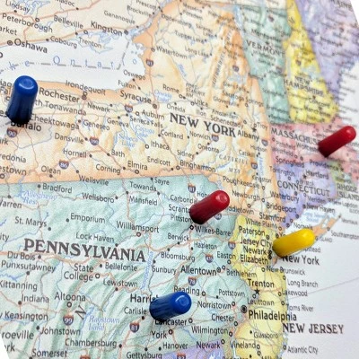 - INTERNATIONAL JOURNEY — The map is created with a patented magnetic surface, allowing you to mark past and future travels without damaging the surface of the artwork.