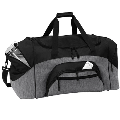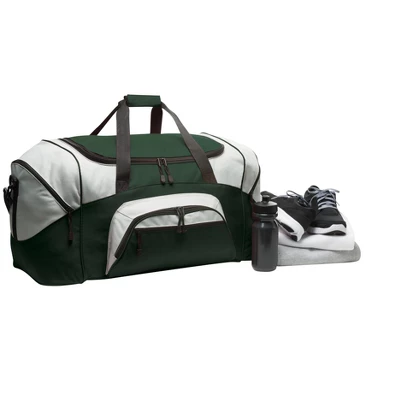 Our best-selling budget-friendly duffel is sized for for sport gear. 600 denier polyester canvas with 210 denier polyester lining D-shaped zippered entry for easy access in main compartmentTwo large zippered end pocketsTwo exterior zippered pockets on frontPadded handleDetachable adjustable shoulder strapTwo front zippered pocketsTwo large side pockets Dimensions: 12.75 h x 27.25 w x 13.5 d; Approx. 4 690 cubic inchesNote: Bags not intended for use by children 12 and under. Includes a California Prop 65 and social responsibility hangtag.