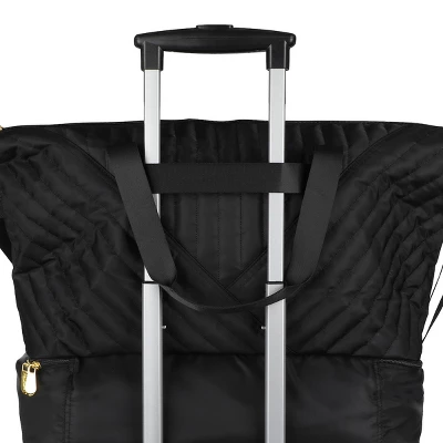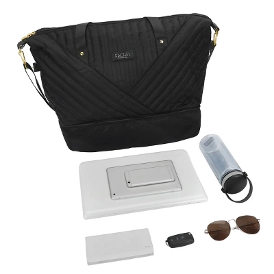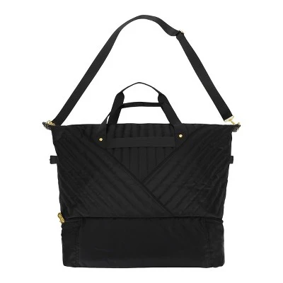 Travel in style with this Rachel Rachel Roy deluxe duffel bag. The bag features a black quilted fabric pattern with gold letters that spell out the designer’s logo on the front and zippers. The bag comes with an adjustable strap, a spacious zipper compartment, and a separate shoe compartment that zips closed to store your footwear. The bag features a trolley pass through that lets you easily attach it to a luggage cart. The duffle bag is made with polyester and webbing materials and measures 22″ W x 18″ H x 8.5″ D. Explore the world in style with this Rachel Roy deluxe duffle bag.