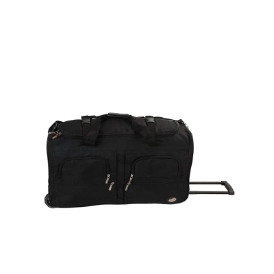 Travel in style with this great soft-sided rolling duffle bag. Bag features a heavy-duty polyester construction. Inline skate wheels for superior mobility, internal retractable hide-away handle system, U-top opening provides easy access to roomy zipper secured main compartment. Two front zipper-secured compartments, adjustable ergonomic shoulder strap. Made of 600 denier heavy duty polyester. Measures 36″L x 14″W x 15″H