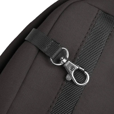 - Main compartment with slip pocket, zippered pocket, and tethered key clip with LED light