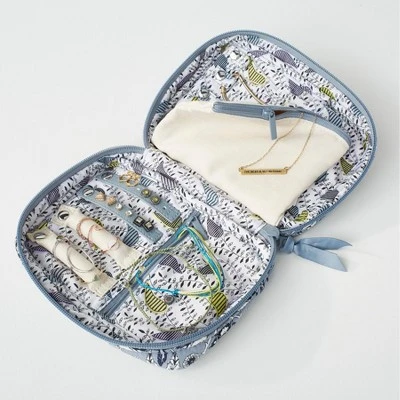Pack up your shiniest baubles and hit the road with this slim jewelry folio. With special spaces for rings and earrings (plus pockets for things like necklaces and bracelets), it will keep you organized wherever your travels take you. Details: Interior features two zip pockets and four elastic slip pockets (both lined with soft, faux-suede to prevent scratches), five snap tabs, two ring rolls and two earring tabs (holds up to six pairs of earrings). Zip closure. Care Tips: Machine wash cold, gentle cycle, only non-chlorine bleach when needed; lay flat to dry